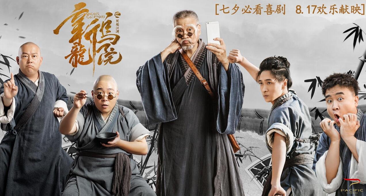 吴孟达饰演的住持长眉师父笑得十分慈爱,俏皮的动作暴露其老顽童个性;王宁、孔连顺和王智三人组腾空跃起,似乎要大闹乌龙院;郝劭文面露惊恐,梁超、今井龙星和曾志伟这三人,一反高冷姿态笑容满面;宋小宝则一副好奇看热闹的样子,展现出别样喜感。