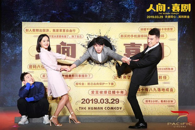 《人间·喜剧》发布会的合影板堪称“脑洞大开”,不仅将片名“人间·喜剧”中的点挖空做成墙洞,让艾伦还原电影中的经典一幕,合影板上还有多条形如弹幕的文案:密码六位数,存款两位数;爱豆被爆已婚十年……被卡在墙上的艾伦,被这些烦恼困扰。最终,三主演将艾伦从洞中拉出。电影将生活的无奈包裹在喜剧外衣中,想让每一个普通人找到自己的影子。