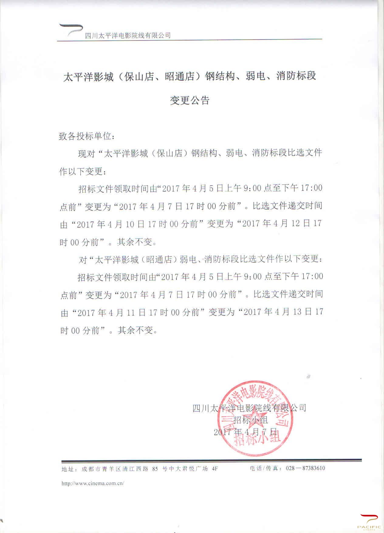 太平洋影城(保山店、昭通店)钢结构、弱电、消防标段变更公告