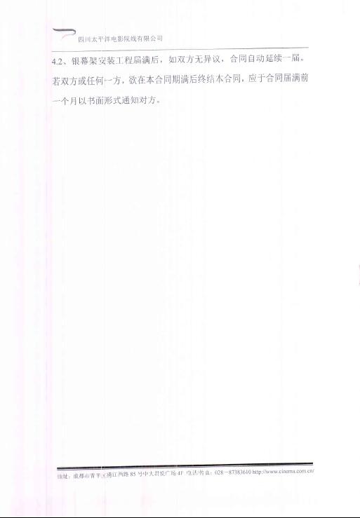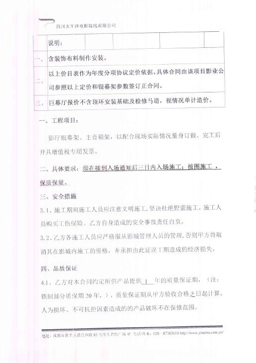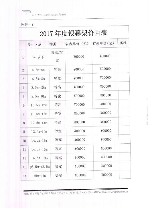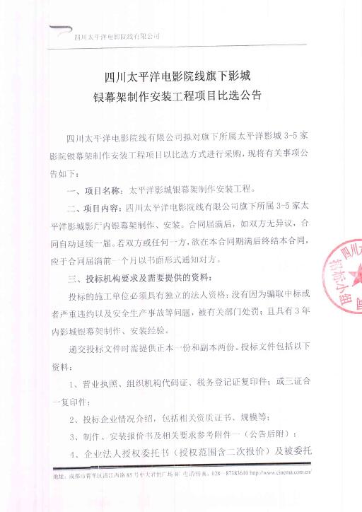 四川太平洋电影院线旗下影城银幕架制作安装工程项目比选公告