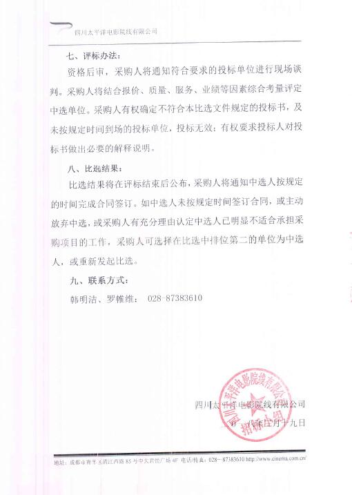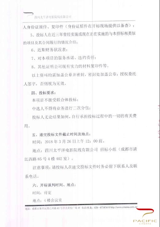 四川太平洋电影院线有限公司2018年喷绘项目比选公告