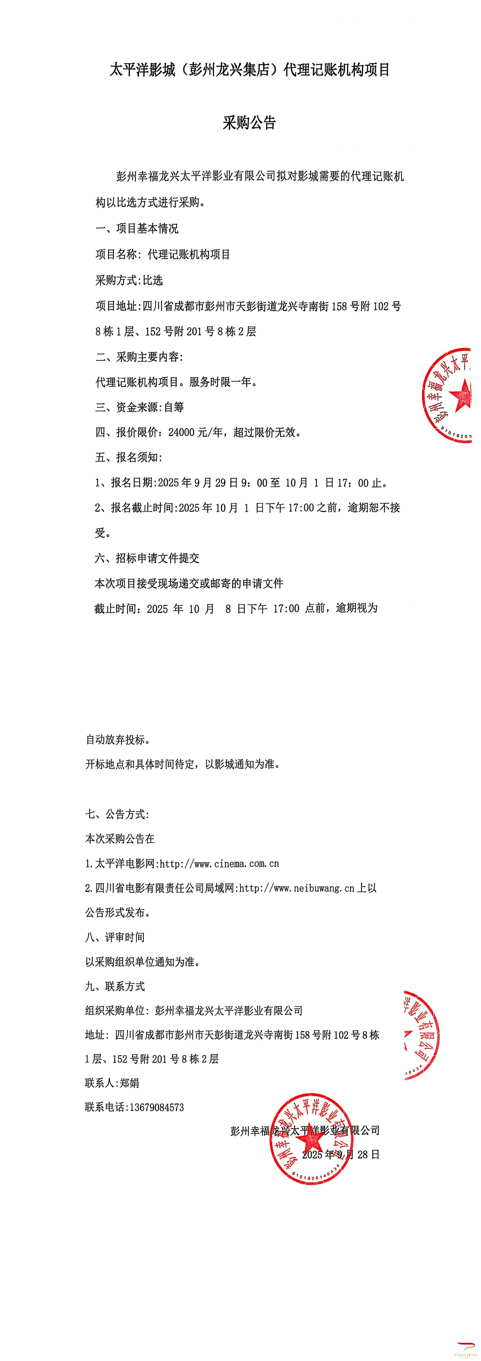 太平洋影城(彭州龙兴集店)代理记账机构项目招标公告