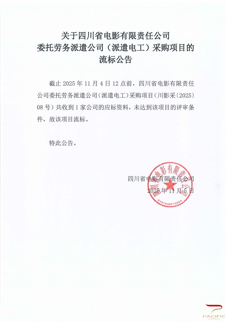 四川省电影有限责任公司委托劳务派遣公司(派遣电工)采购项目流标公告