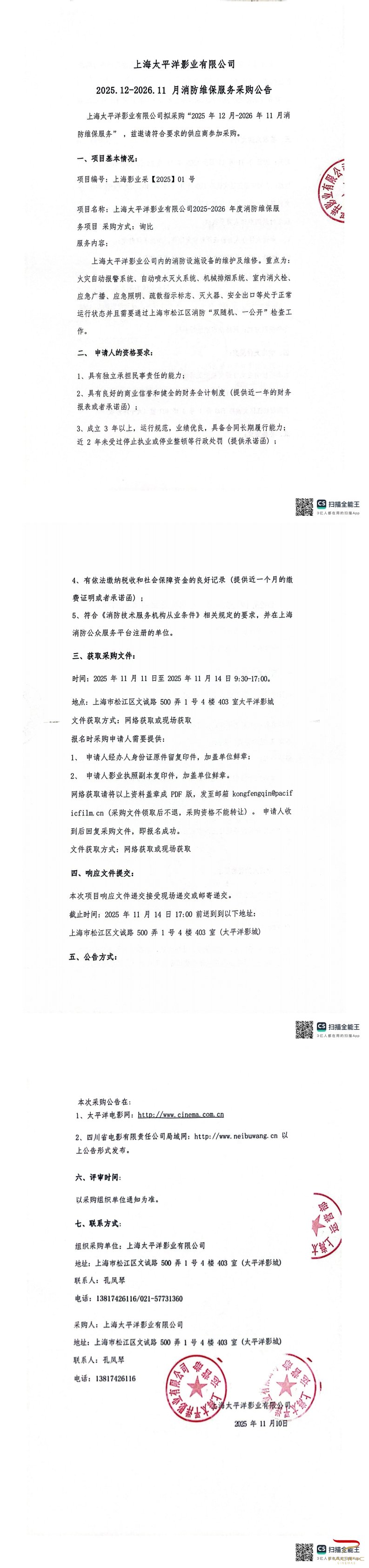 上海太平洋影业有限公司2025.12月-2026.11月消防维保服务采购公告