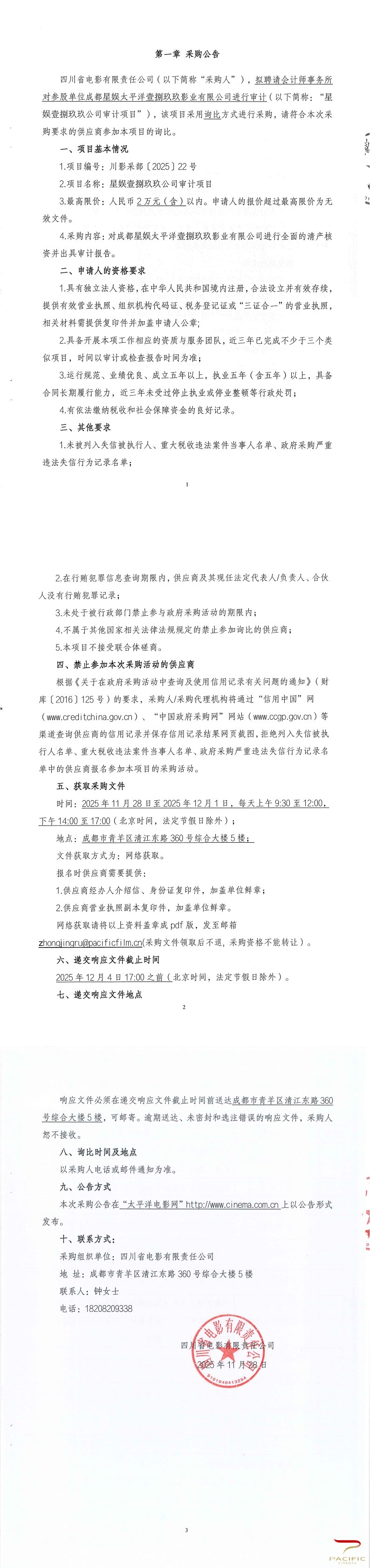 成都星娱太平洋壹捌玖玖影业有限公司审计项目采购公告