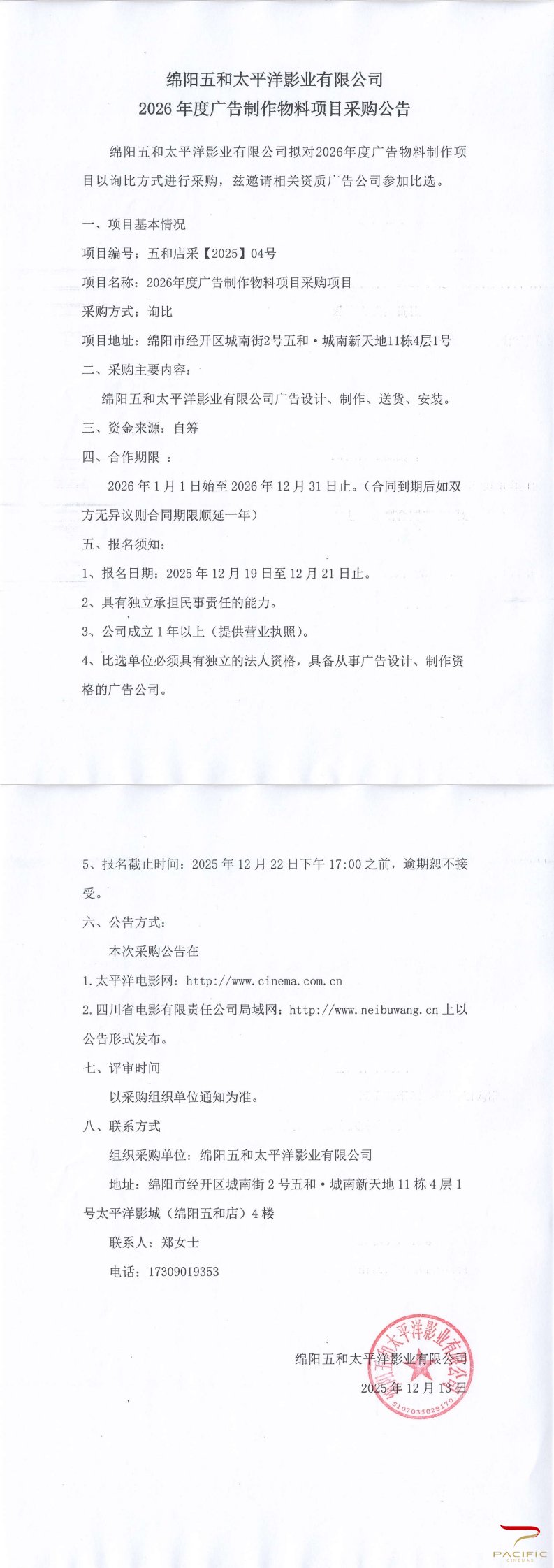 绵阳五和太平洋影业有限公司2026年广告物料制作采购公告