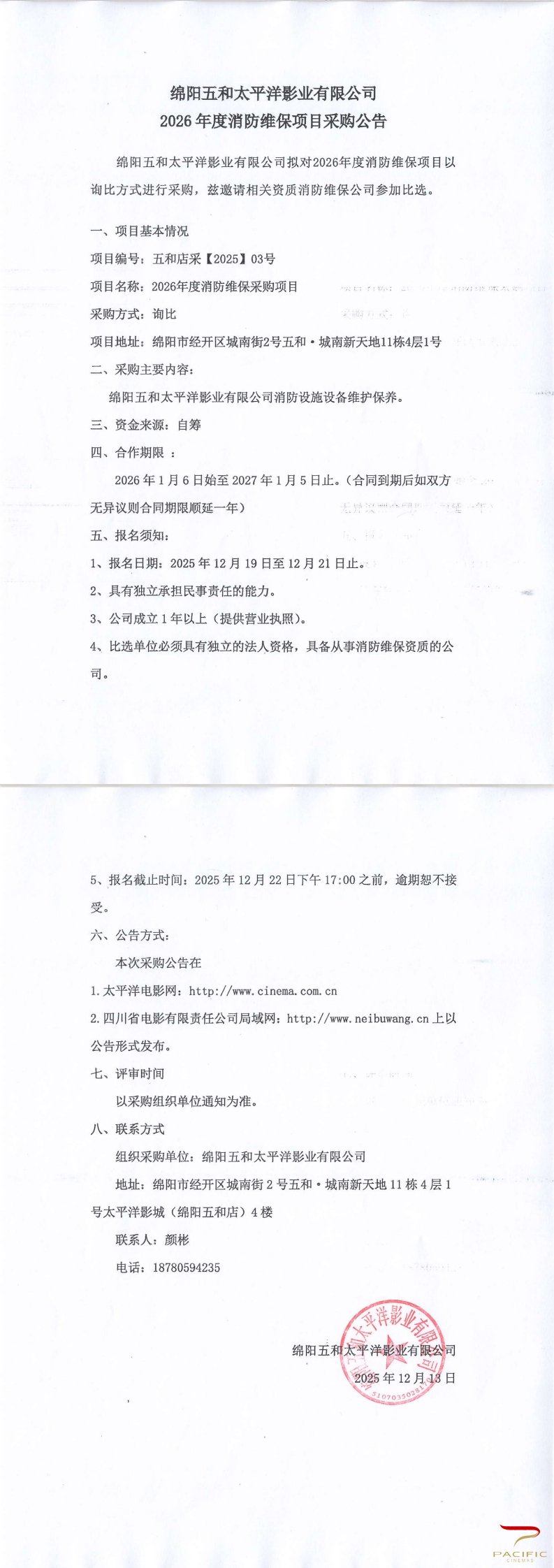 绵阳五和太平洋影业有限公司2026年度消防维保项目采购公告