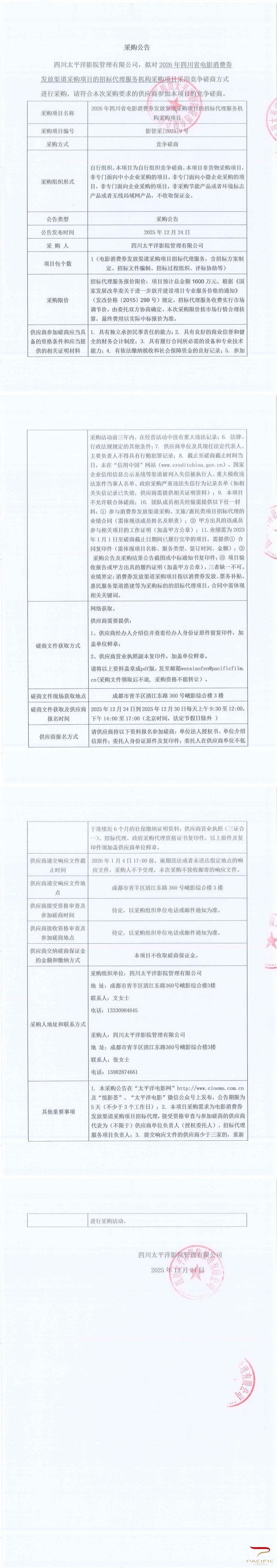 四川太平洋影院管理有限公司建立影城商业类保险采购项目竞争性磋商公告