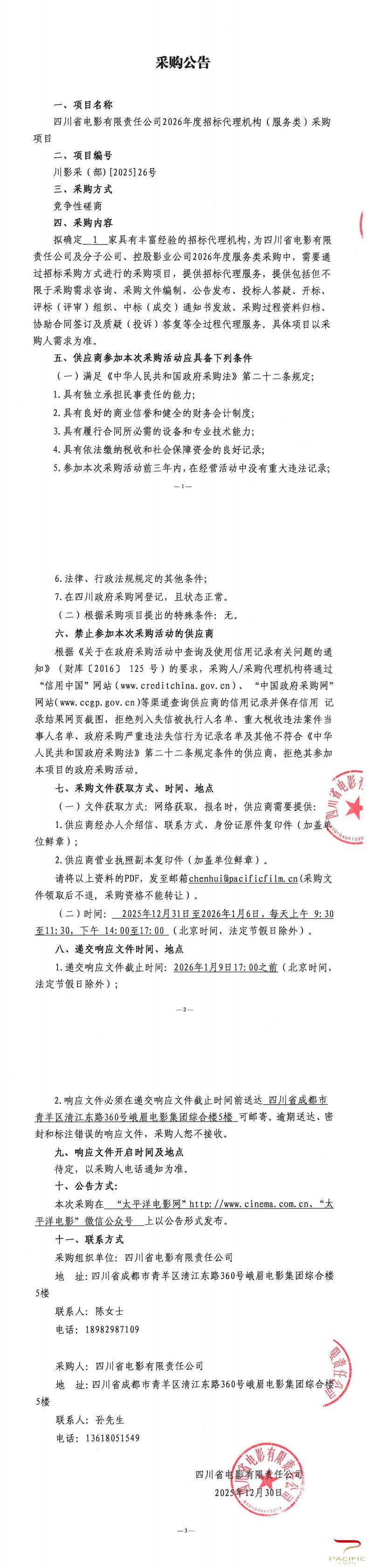 四川省电影有限责任公司2026年度招标代理机构(服务类)采购项目-采购公告