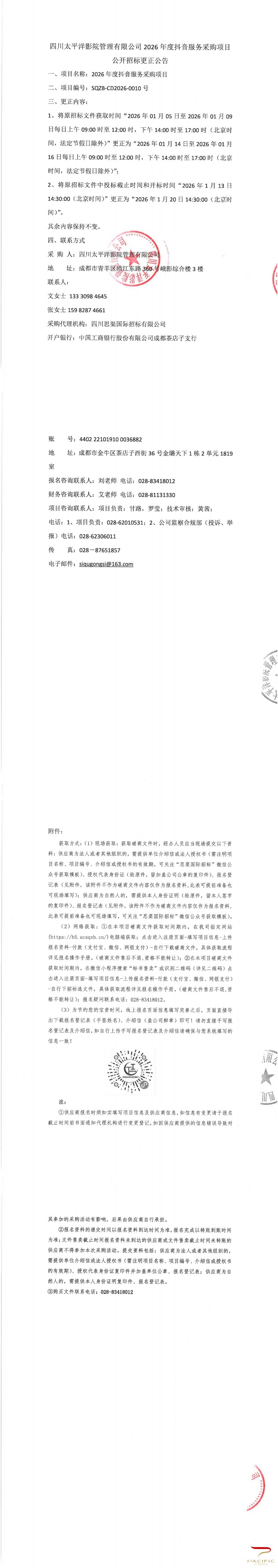 四川太平洋影院管理有限公司2026年度抖音服务采购项目公开招标更正公告