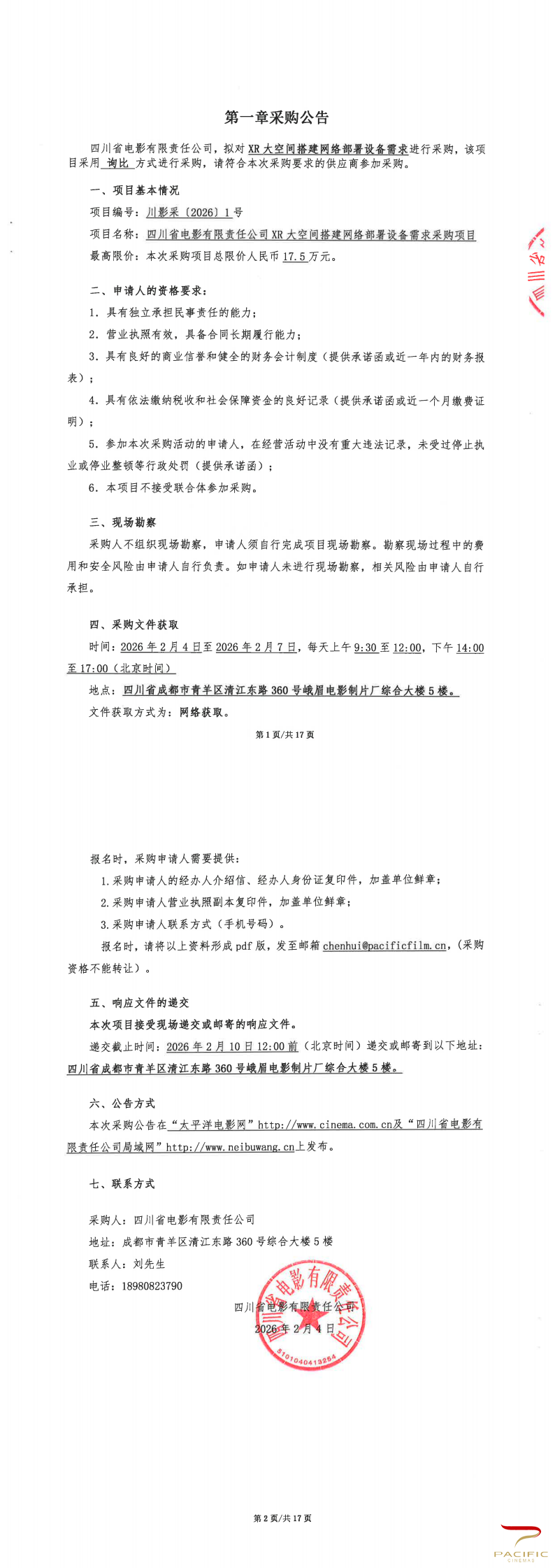 四川省电影有限责任公司XR大空间搭建网络部署设备需求采购公告
