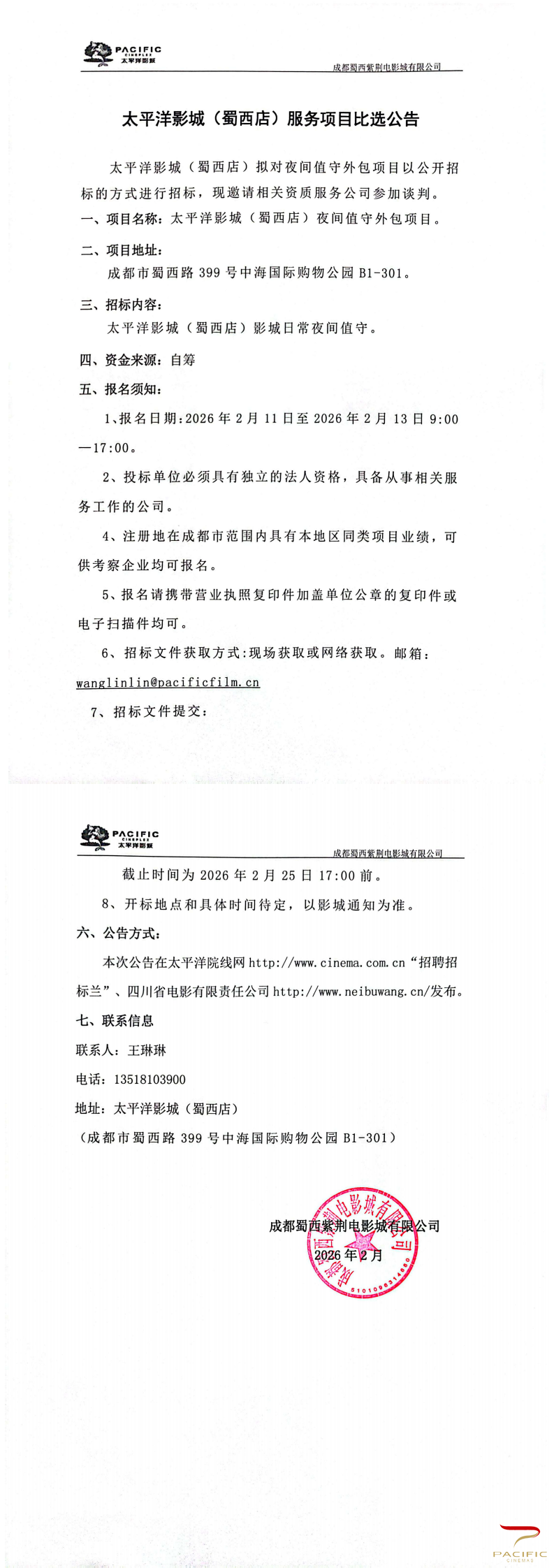 太平洋影城(蜀西店)服务项目比选公告