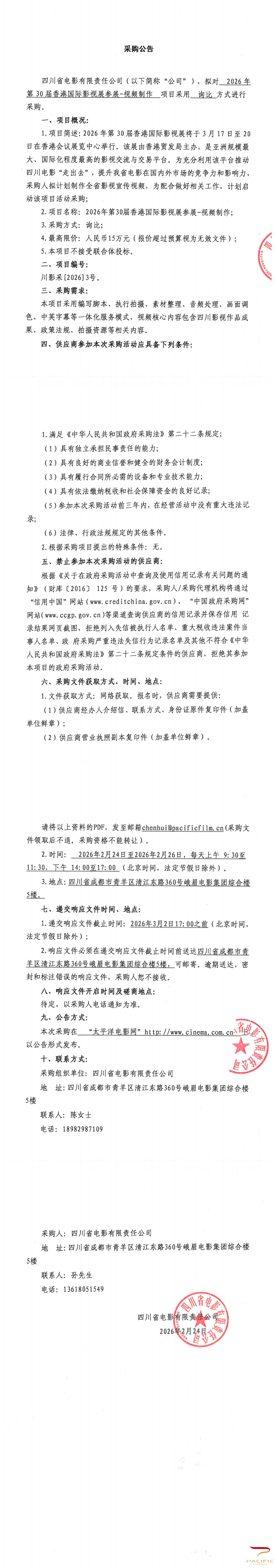 四川省电影有限责任公司“2026年第30届香港国际影视展参展-视频制作”项目-采购公告
