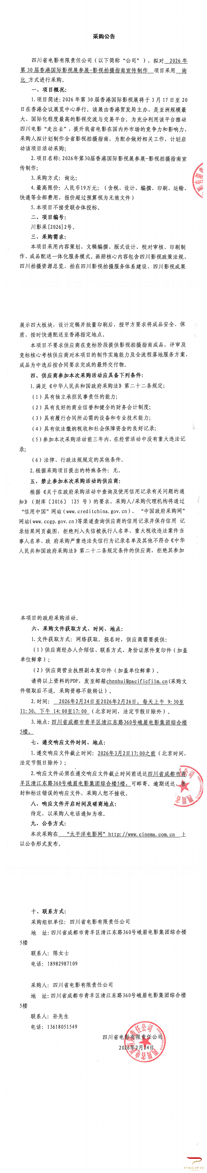四川省电影有限责任公司“2026年第30届香港国际影视展参展-视频制作”项目-采购公告