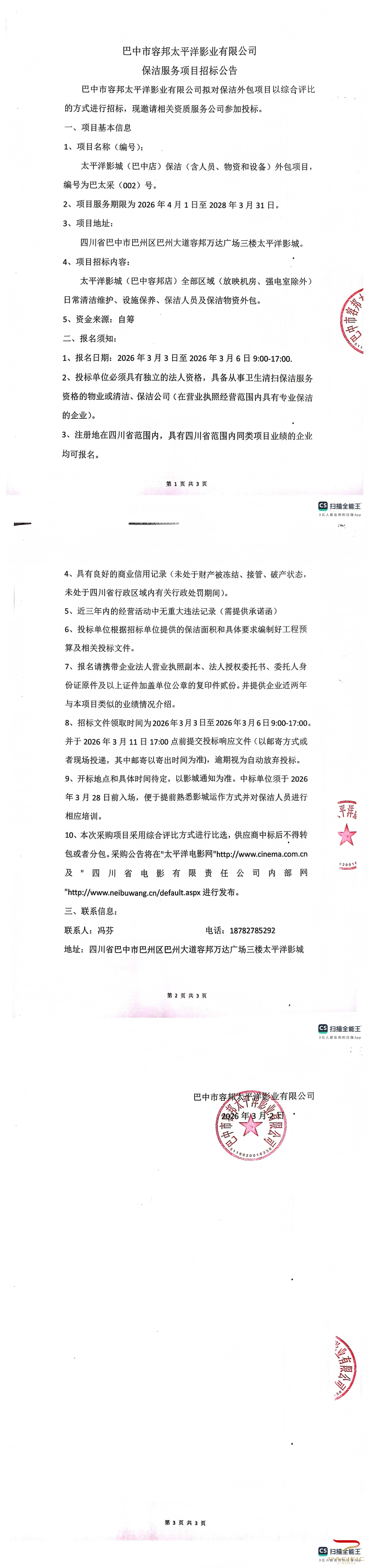 巴中市容邦太平洋影业有限公司保洁服务项目招标公告